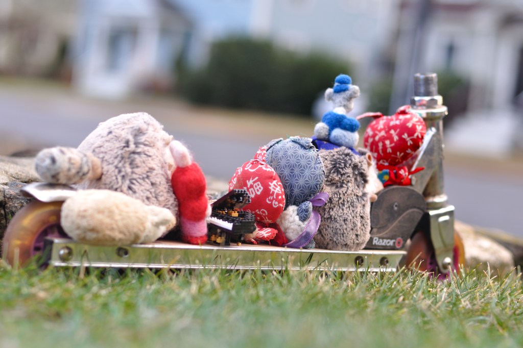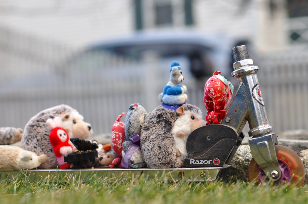 They all held on tight, as Meow scooted them out the driveway. She was the leader, and all the other cats and hedgehogs cheered with delight at her skills. Every one of them seemed to admire the way Meow could swerve so elegantly down the sidewalk. They had never seen such a talented athlete. Captain Tinker watched from the window. He smiled.