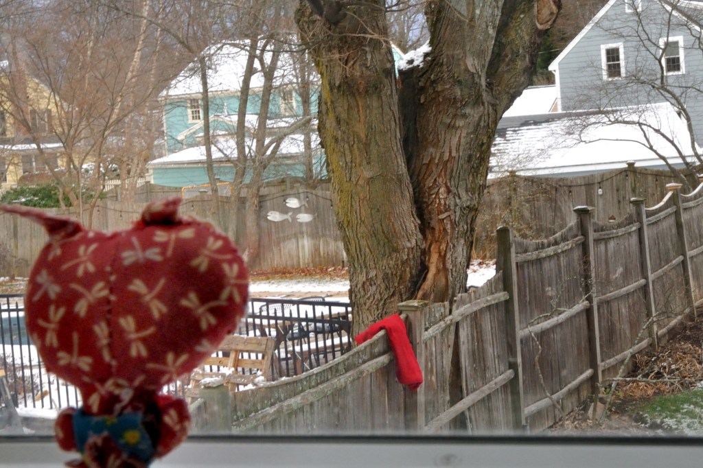 One fine winter day the little red cat, Meow, sat at the window of her house. Dreamily, she watched her red scarf drying on the fence in the garden.