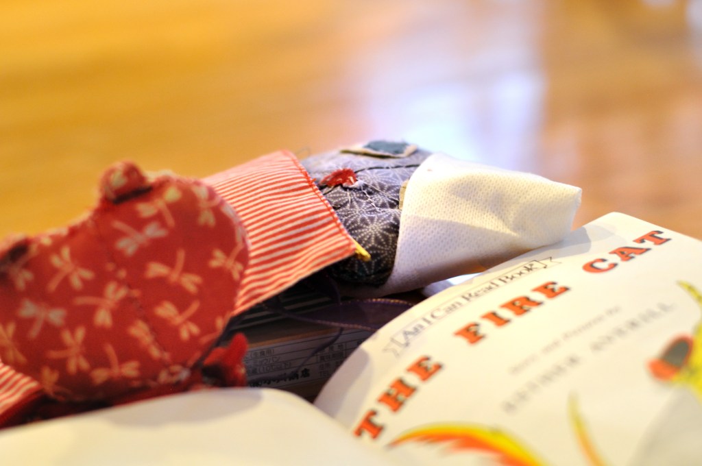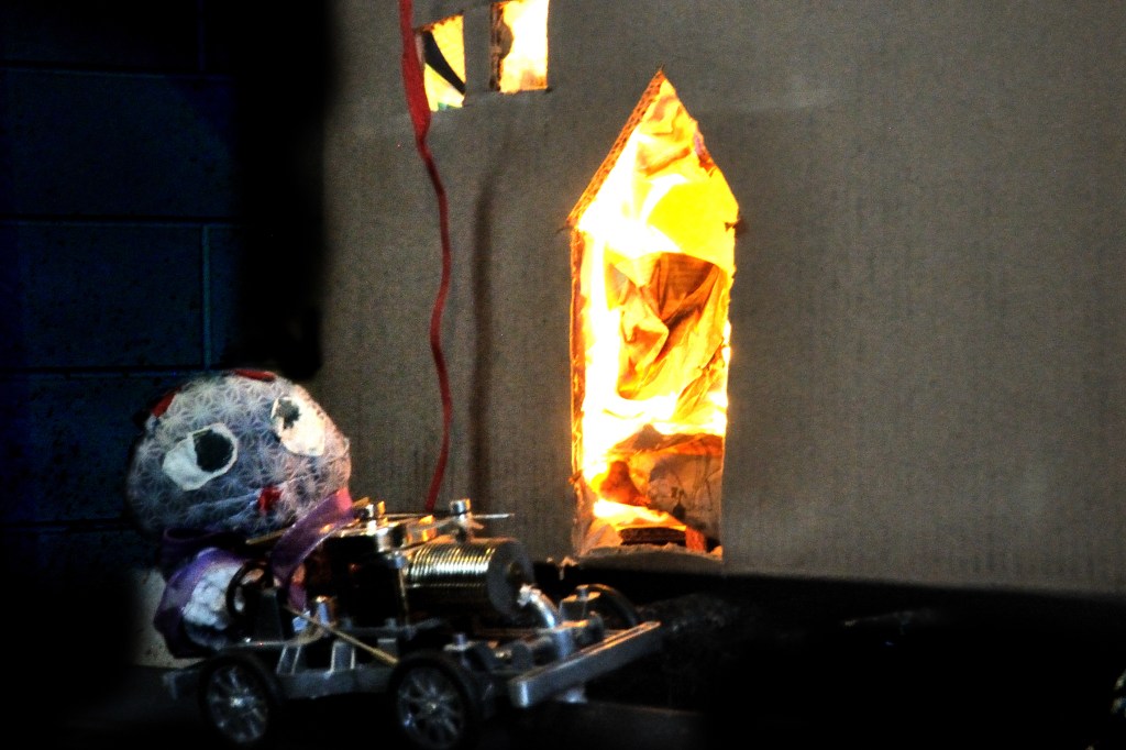 Despite the risk of fire, QT bravely fought the fire. “Oh no,” thought Meow to herself, far away at the Club meeting. “My scarf is in the den. QT can save my scarf.” But then she stopped. “No, I mustn’t interrupt him. I mustn’t go to the fire and ask him to stop his noble work just to rescue my scarf.”