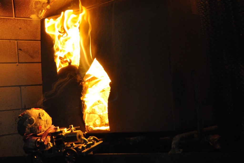 Meow stayed away from the fire. “I mustn’t go and watch the fire,” thought Meow, “because if QT saw me he might remember my scarf and try to save it, when he shouldn’t.”
